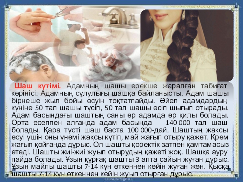 Слайд 8 Шаш күтімі. Адамның шашы ерекше жаралған табиғат көрінісі. Адамның сұлулығы