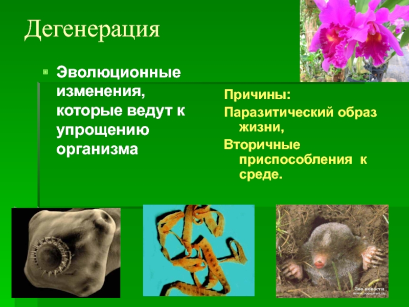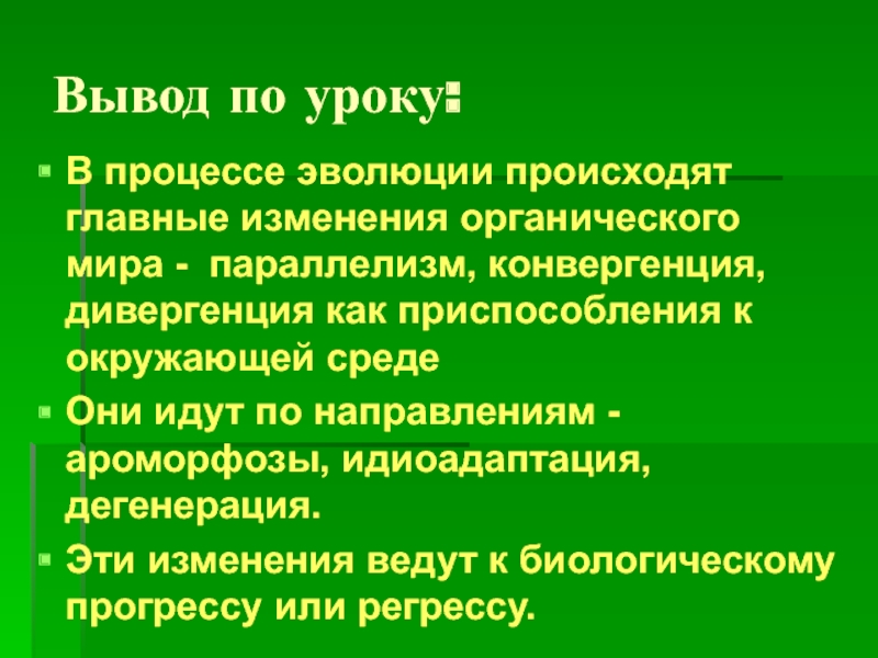 Для биологического регресса характеристики противоположные, в результате возможно полное вымирание этой группы организмов. По пути биологического регресса пошли динозавры, псилофиты, семенные папоротники. В настоящее время вымирание грозит многим видам растений и животных, для спасения которых созданы заповедники, заказники, они занесены в Красные книги.