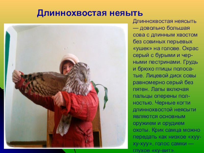 сова с длинным хвостом без совиных перьевых «ушек» на голове. Окрас серый с бурыми и чер-ными пестринами. Грудь и брюхо птицы полоса-тые. Лицевой диск совы равномерно серый без пятен. Лапы включая пальцы оперены пол-ностью. Черные когти длиннохвостой неясыти являются основным оружием и орудием охоты. Крик самца можно передать как низкое «хуу-ху-хуу», голос самки — глухое «ку-вит».