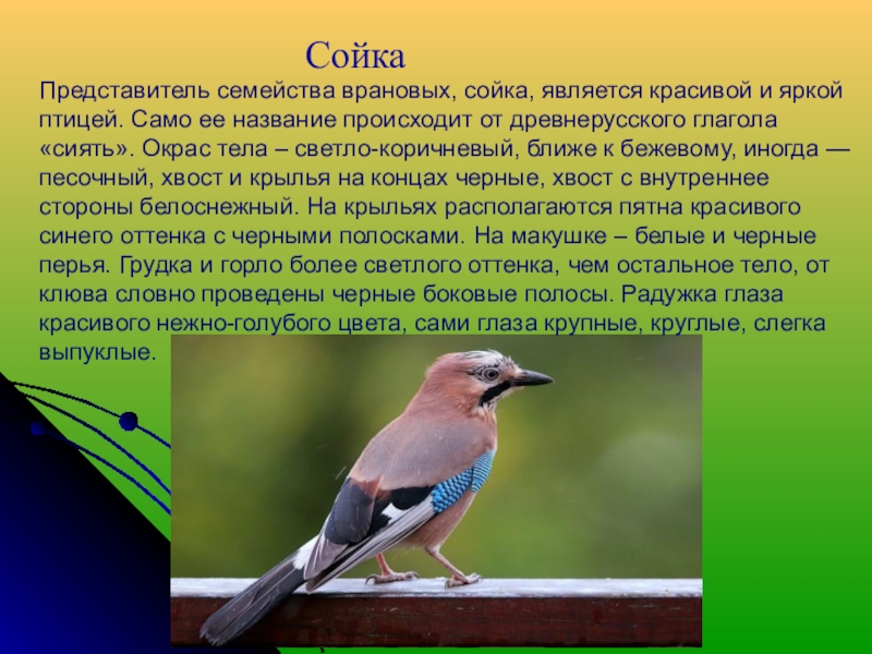 птицей. Само ее название происходит от древнерусского глагола «сиять». Окрас тела – светло-коричневый, ближе к бежевому, иногда — песочный, хвост и крылья на концах черные, хвост с внутреннее стороны белоснежный. На крыльях располагаются пятна красивого синего оттенка с черными полосками. На макушке – белые и черные перья. Грудка и горло более светлого оттенка, чем остальное тело, от клюва словно проведены черные боковые полосы. Радужка глаза красивого нежно-голубого цвета, сами глаза крупные, круглые, слегка выпуклые.