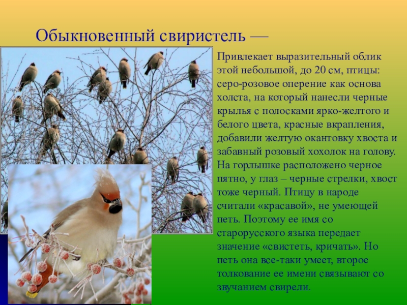 см, птицы: серо-розовое оперение как основа холста, на который нанесли черные крылья с полосками ярко-желтого и белого цвета, красные вкрапления, добавили желтую окантовку хвоста и забавный розовый хохолок на голову. На горлышке расположено черное пятно, у глаз – черные стрелки, хвост тоже черный. Птицу в народе считали «красавой», не умеющей петь. Поэтому ее имя со старорусского языка передает значение «свистеть, кричать». Но петь она все-таки умеет, второе толкование ее имени связывают со звучанием свирели.