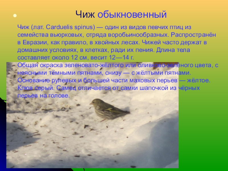 Чиж (лат. Carduelis spinus) — один из видов певчих птиц из семейства вьюрковых, отряда воробьинообразных. Распространён в Евразии, как правило, в хвойных лесах. Чижей часто держат в домашних условиях, в клетках, ради их пения. Длина тела составляет около 12 см, весит 12—14 г.