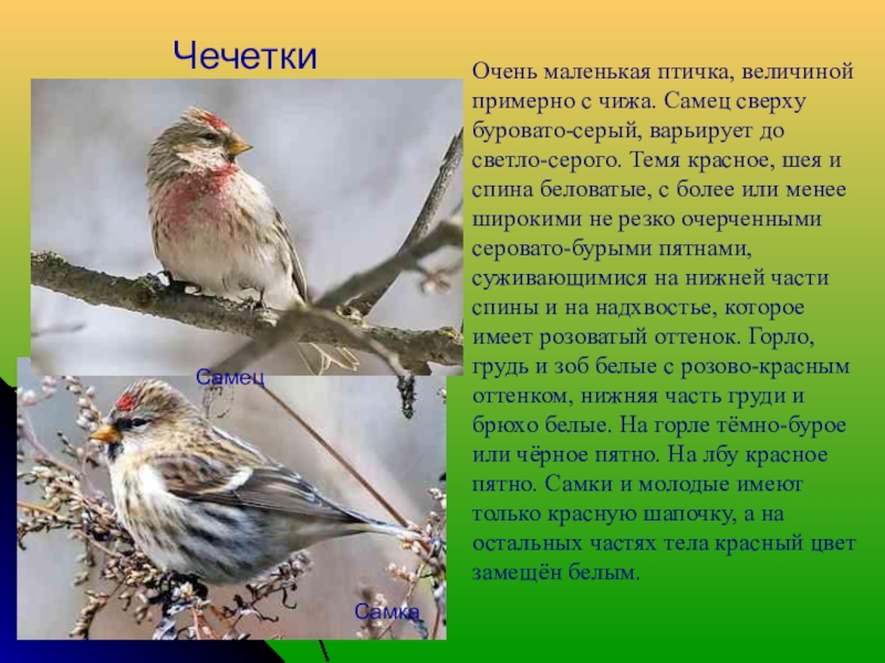 с чижа. Самец сверху буровато-серый, варьирует до светло-серого. Темя красное, шея и спина беловатые, с более или менее широкими не резко очерченными серовато-бурыми пятнами, суживающимися на нижней части спины и на надхвостье, которое имеет розоватый оттенок. Горло, грудь и зоб белые с розово-красным оттенком, нижняя часть груди и брюхо белые. На горле тёмно-бурое или чёрное пятно. На лбу красное пятно. Самки и молодые имеют только красную шапочку, а на остальных частях тела красный цвет замещён белым.