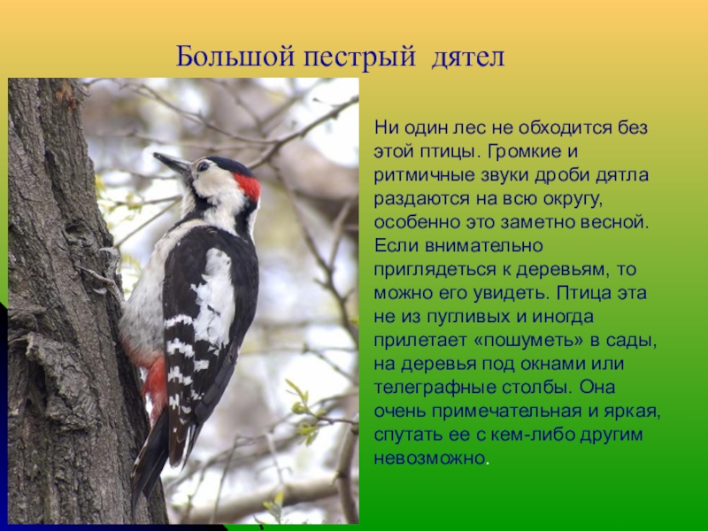 обходится без этой птицы. Громкие и ритмичные звуки дроби дятла раздаются на всю округу, особенно это заметно весной. Если внимательно приглядеться к деревьям, то можно его увидеть. Птица эта не из пугливых и иногда прилетает «пошуметь» в сады, на деревья под окнами или телеграфные столбы. Она очень примечательная и яркая, спутать ее с кем-либо другим невозможно.