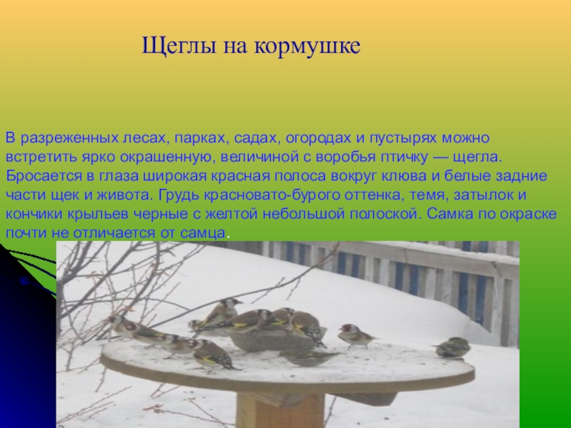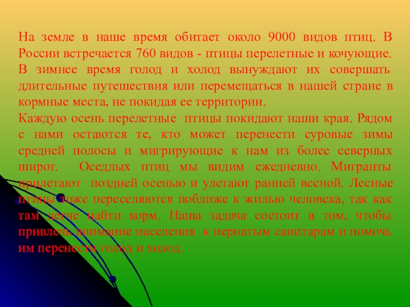 Каждую осень перелетные птицы покидают наши края. Рядом с нами остаются те, кто может перенести суровые зимы средней полосы и мигрирующие к нам из более северных широт. Оседлых птиц мы видим ежедневно. Мигранты прилетают поздней осенью и улетают ранней весной. Лесные птицы тоже переселяются поближе к жилью человека, так как там легче найти корм. Наша задача состоит в том, чтобы привлечь внимание населения к пернатым санитарам и помочь им перенести голод и холод.