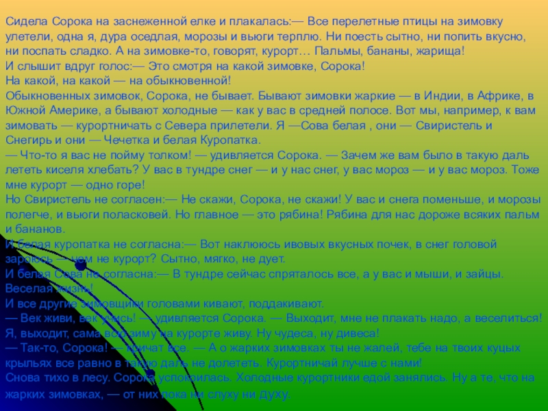 Сидела Сорока на заснеженной елке и плакалась:— Все перелетные птицы на