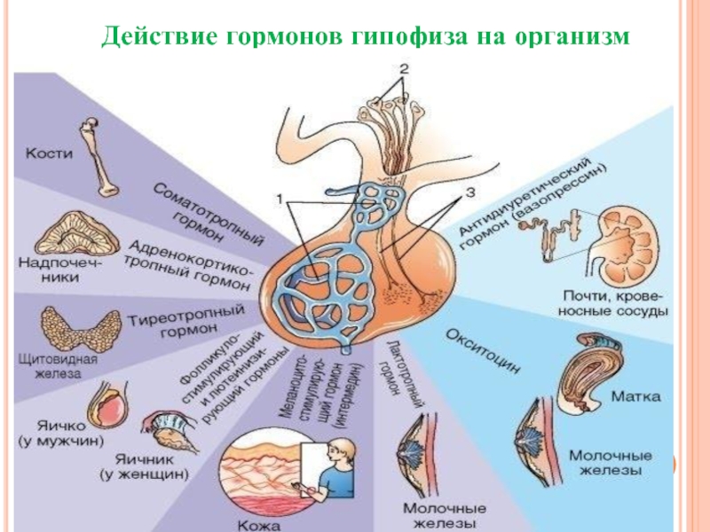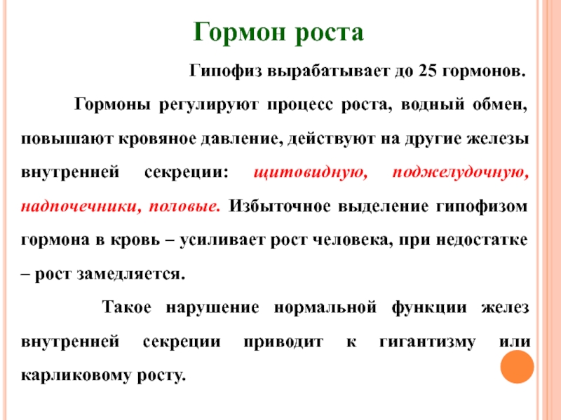 Гормоны регулируют процесс роста, водный обмен, повышают кровяное давление, действуют на другие железы внутренней секреции: щитовидную, поджелудочную, надпочечники, половые. Избыточное выделение гипофизом гормона в кровь – усиливает рост человека, при недостатке – рост замедляется.