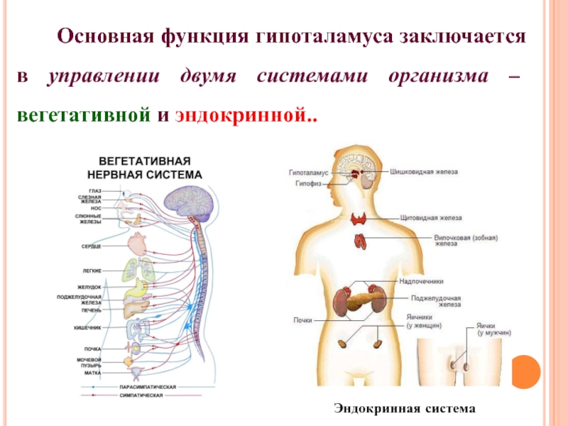 Слайд 7 Основная функция гипоталамуса заключается в управлении двумя