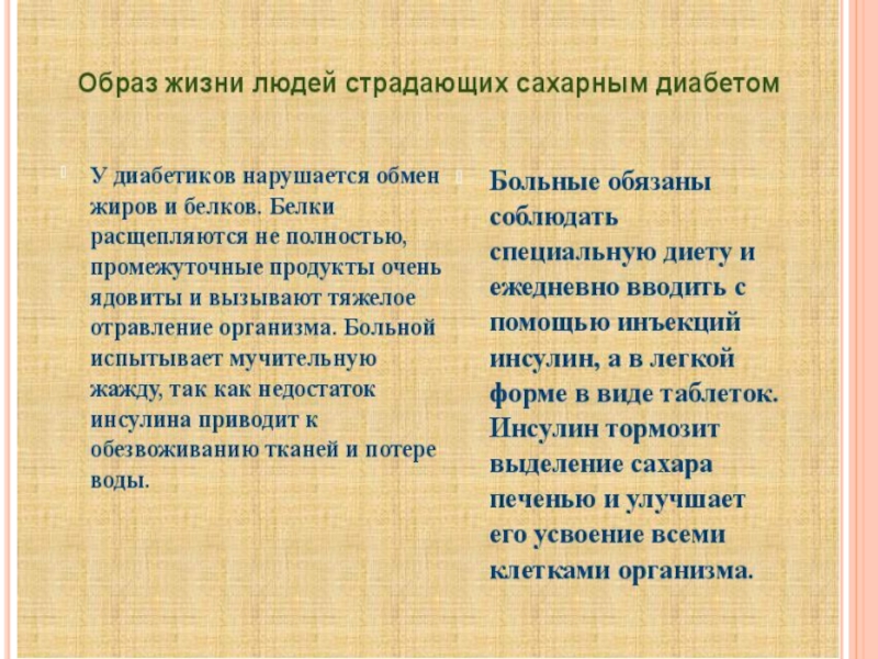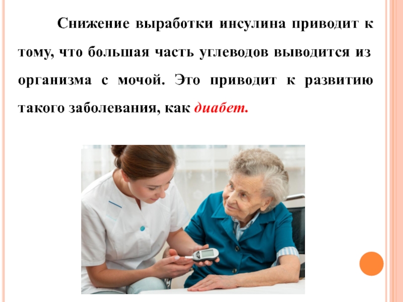 Слайд 16 Снижение выработки инсулина приводит к тому, что
