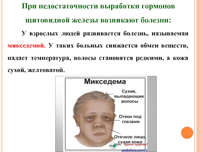 взрослых людей развивается болезнь, называемая микседемой. У таких больных снижается обмен веществ, падает температура, волосы становятся редкими, а кожа сухой, желтоватой.