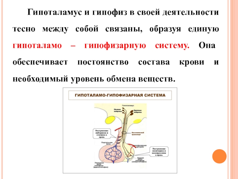 Слайд 6 Гипоталамус и гипофиз в своей деятельности тесно между