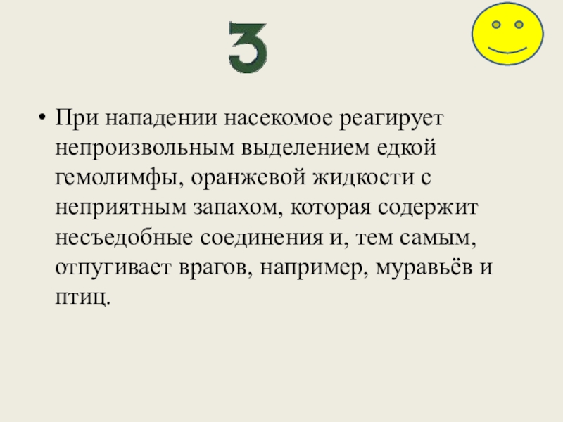 Слайд 27При нападении насекомое реагирует непроизвольным выделением едкой гемолимфы, оранжевой жидкости с