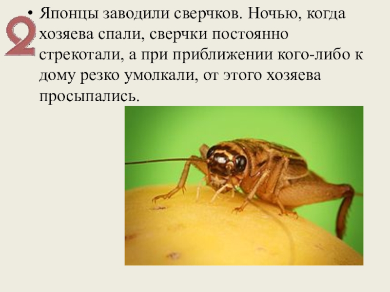 Слайд 41Японцы заводили сверчков. Ночью, когда хозяева спали, сверчки постоянно стрекотали, а