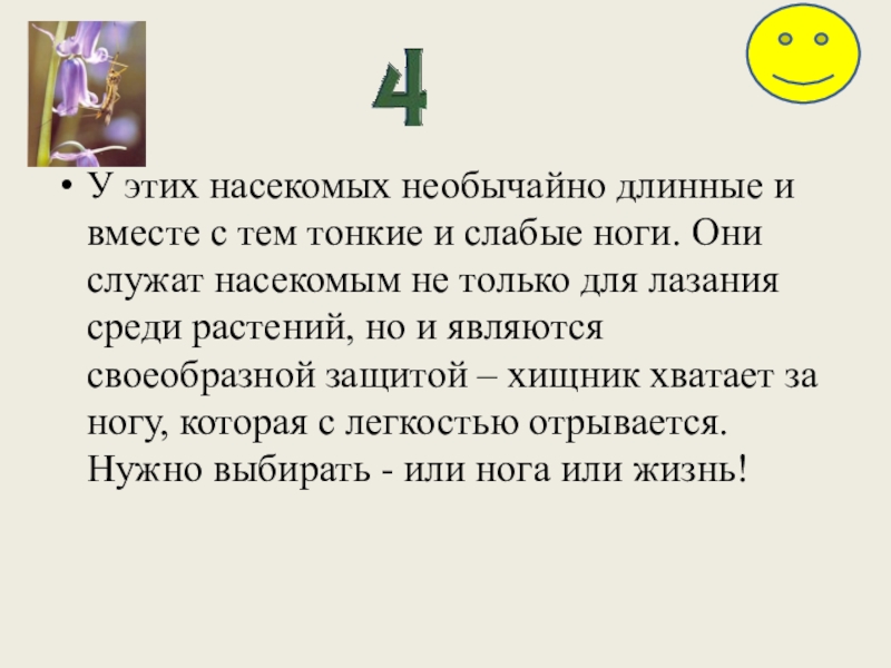 слабые ноги. Они служат насекомым не только для лазания среди растений, но и являются своеобразной защитой – хищник хватает за ногу, которая с легкостью отрывается. Нужно выбирать - или нога или жизнь!