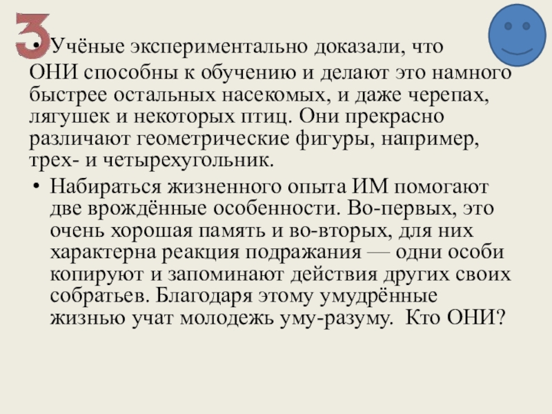 Набираться жизненного опыта ИМ помогают две врождённые особенности. Во-первых, это очень хорошая память и во-вторых, для них характерна реакция подражания — одни особи копируют и запоминают действия других своих собратьев. Благодаря этому умудрённые жизнью учат молодежь уму-разуму. Кто ОНИ?