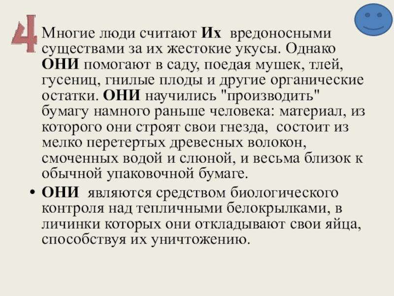 ОНИ помогают в саду, поедая мушек, тлей, гусениц, гнилые плоды и другие органические остатки. ОНИ научились "производить" бумагу намного раньше человека: материал, из которого они строят свои гнезда, состоит из мелко перетертых древесных волокон, смоченных водой и слюной, и весьма близок к обычной упаковочной бумаге.