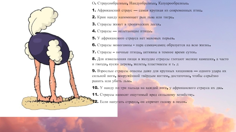 - Страусообразные, Нандуобразные, Казуарообразные;