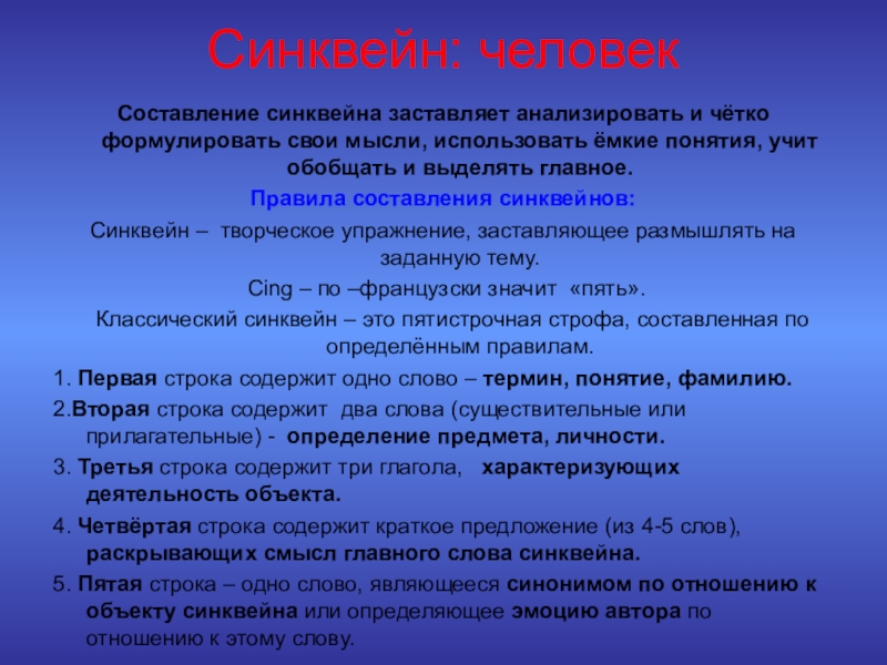 Классический синквейн – это пятистрочная строфа, составленная по определённым правилам.