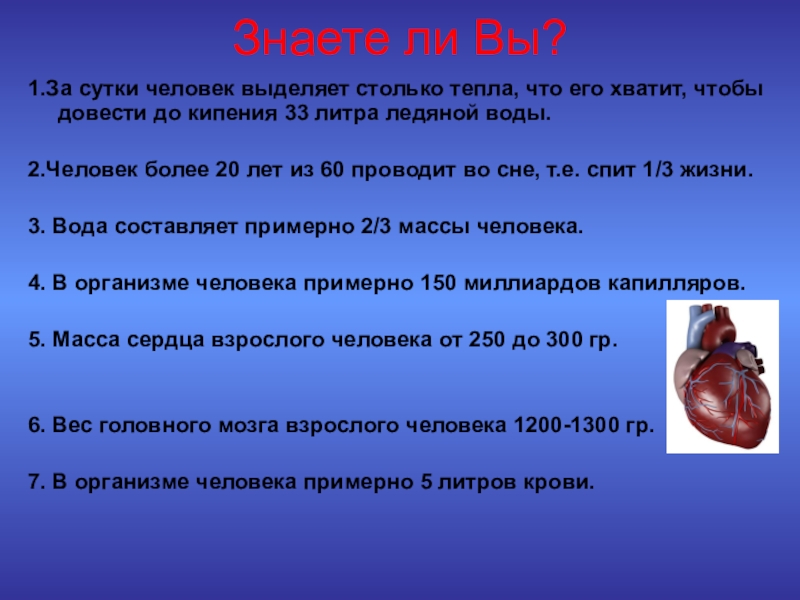 1.За сутки человек выделяет столько тепла, что его хватит,