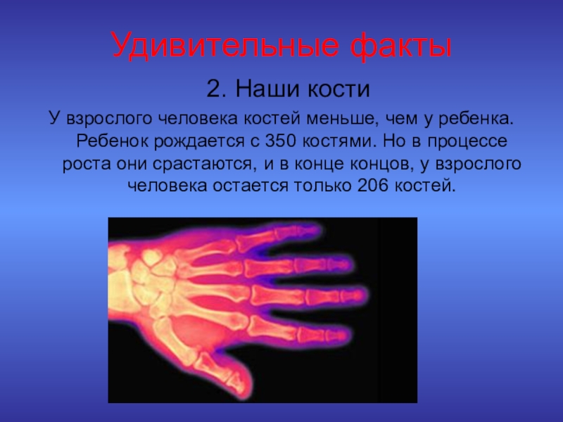 У взрослого человека костей меньше, чем у ребенка. Ребенок рождается с 350 костями. Но в процессе роста они срастаются, и в конце концов, у взрослого человека остается только 206 костей.