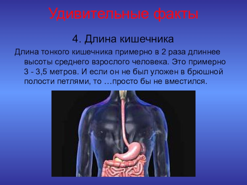 среднего взрослого человека. Это примерно 3 - 3,5 метров. И если он не был уложен в брюшной полости петлями, то …просто бы не вместился.