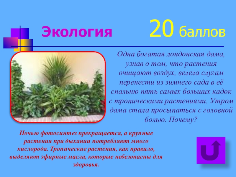 Ночью фотосинтез прекращается, а крупные растения при дыхании потребляют много кислорода. Тропические растения, как правило, выделяют эфирные масла, которые небезопасны для здоровья.