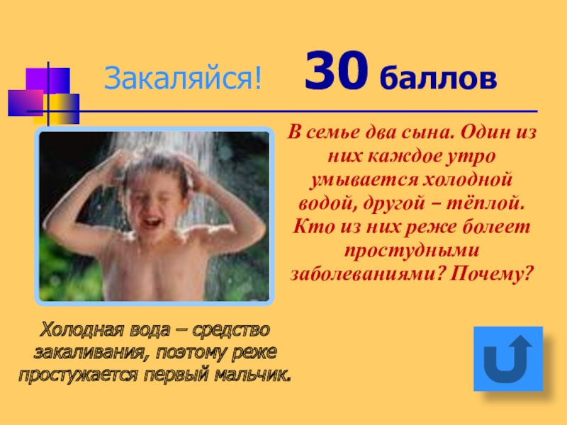 Холодная вода – средство закаливания, поэтому реже простужается первый мальчик.