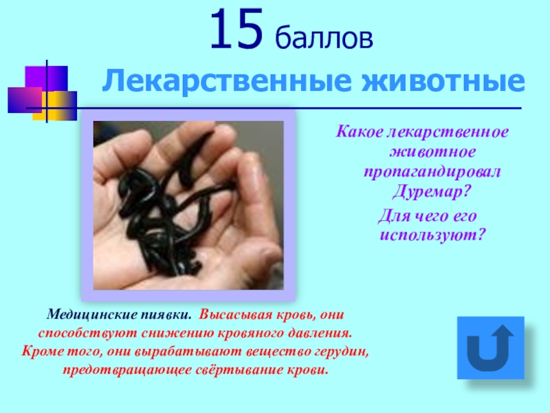 Медицинские пиявки. Высасывая кровь, они способствуют снижению кровяного давления. Кроме того, они вырабатывают вещество герудин, предотвращающее свёртывание крови.