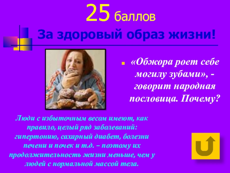 Люди с избыточным весом имеют, как правило, целый ряд заболеваний: гипертонию, сахарный диабет, болезни печени и почек и т.д. – поэтому их продолжительность жизни меньше, чем у людей с нормальной массой тела.