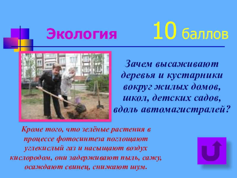 Кроме того, что зелёные растения в процессе фотосинтеза поглощают углекислый газ и насыщают воздух кислородом, они задерживают пыль, сажу, осаждают свинец, снижают шум.