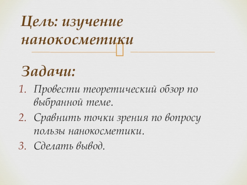 Задачи: Провести теоретический обзор по выбранной теме.Сравнить точки зрения по вопросу пользы нанокосметики.Сделать вывод.Цель: изучение нанокосметики