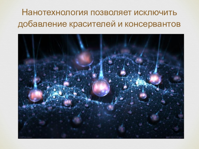 Слайд 6Нанотехнология позволяет исключить добавление красителей и консервантов