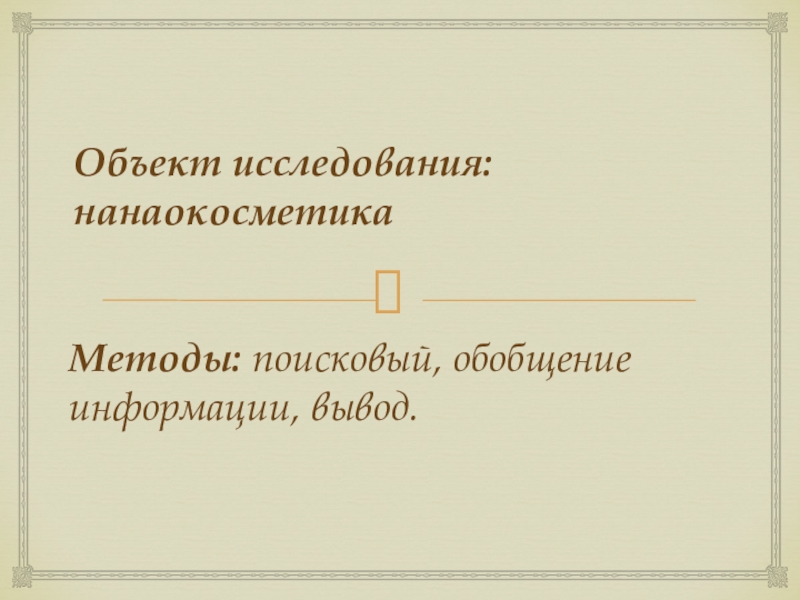 Объект исследования: нанаокосметика Методы: поисковый, обобщение информации, вывод.
