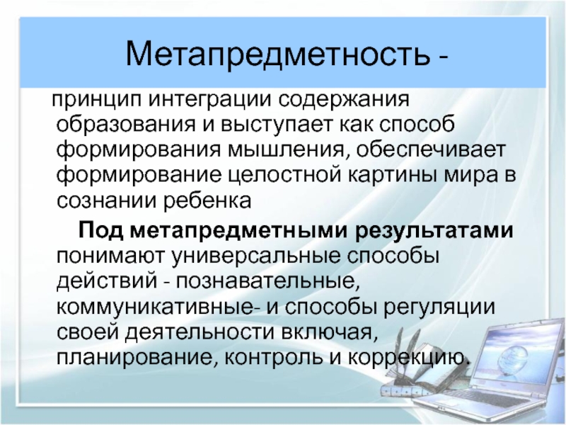 Под метапредметными результатами понимают универсальные способы действий - познавательные, коммуникативные- и способы регуляции своей деятельности включая, планирование, контроль и коррекцию.