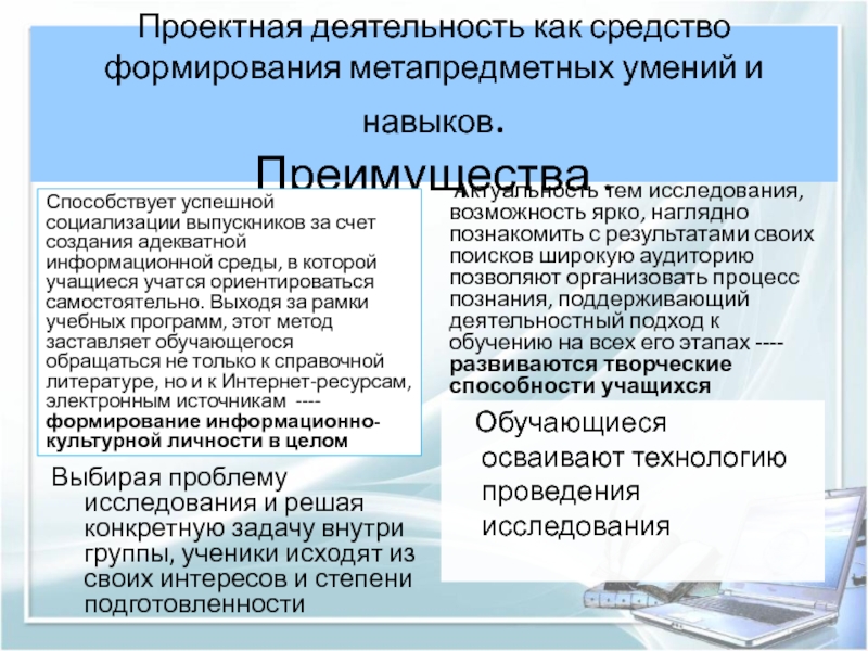 социализации выпускников за счет создания адекватной информационной среды, в которой учащиеся учатся ориентироваться самостоятельно. Выходя за рамки учебных программ, этот метод заставляет обучающегося обращаться не только к справочной литературе, но и к Интернет-ресурсам, электронным источникам ----формирование информационно-культурной личности в целом