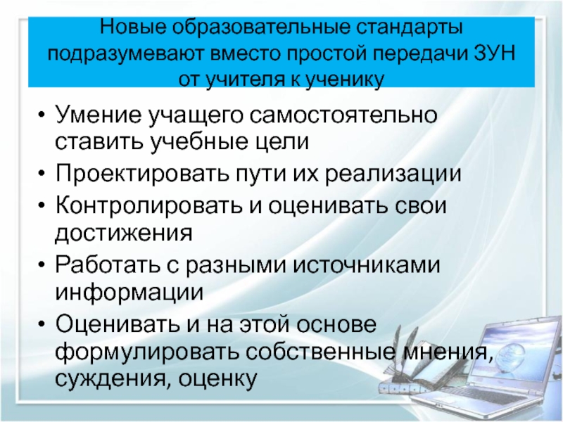 Слайд 3Новые образовательные стандарты подразумевают вместо простой передачи ЗУН от учителя к