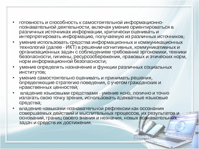 умение использовать средства информационных и коммуникационных технологий (далее - ИКТ) в решении когнитивных, коммуникативных и организационных задач с соблюдением требований эргономики, техники безопасности, гигиены, ресурсосбережения, правовых и этических норм, норм информационной безопасности;