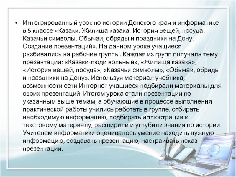 классе «Казаки. Жилища казака. История вещей, посуда. Казачьи символы. Обычаи, обряды и праздники на Дону. Создание презентаций». На данном уроке учащиеся разбивались на рабочие группы. Каждая из групп получала тему презентации: «Казаки-люди вольные», «Жилища казака», «История вещей, посуда», «Казачьи символы», «Обычаи, обряды и праздники на Дону». Используя материал учебника, возможности сети Интернет учащиеся подбирали материалы для своих презентаций. Итогом урока стали презентации по указанным выше темам, а обучающие в процессе выполнения практической работы учились работать в группе, отбирать необходимую информацию, подбирать иллюстрации к текстовому материалу, расширили и углубили знания по истории. Учителем информатики оценивалось умение находить нужную информацию, создавать презентацию, настраивать показ презентации.