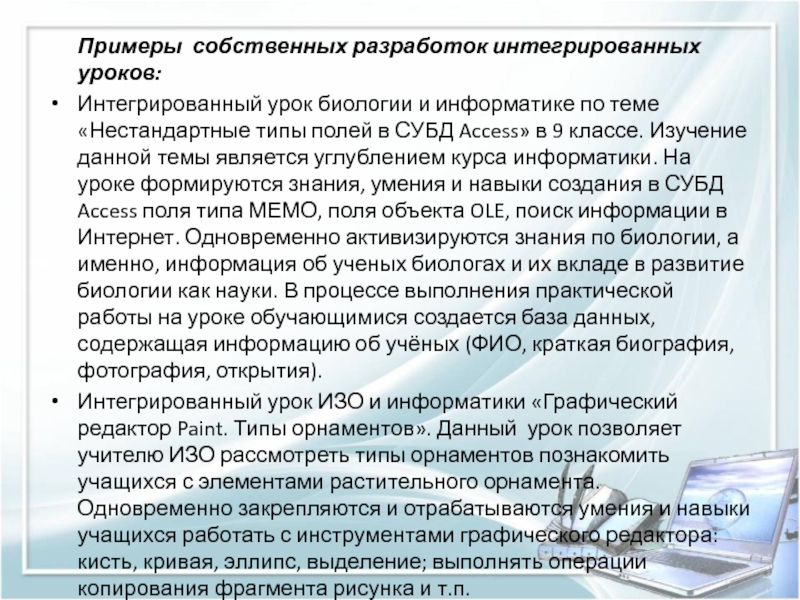 и информатике по теме «Нестандартные типы полей в СУБД Access» в 9 классе. Изучение данной темы является углублением курса информатики. На уроке формируются знания, умения и навыки создания в СУБД Access поля типа МЕМО, поля объекта OLE, поиск информации в Интернет. Одновременно активизируются знания по биологии, а именно, информация об ученых биологах и их вкладе в развитие биологии как науки. В процессе выполнения практической работы на уроке обучающимися создается база данных, содержащая информацию об учёных (ФИО, краткая биография, фотография, открытия).