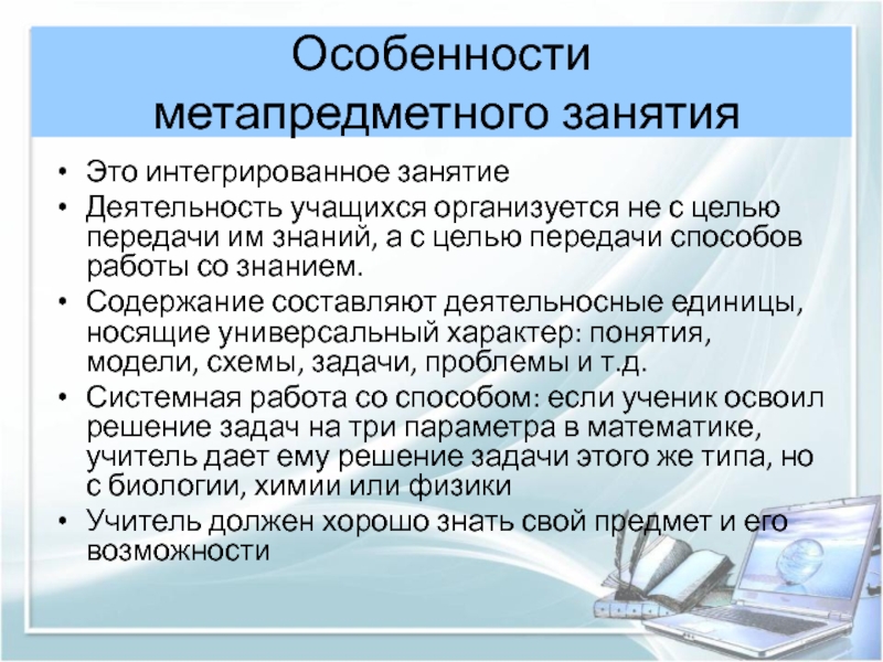 Содержание составляют деятельносные единицы, носящие универсальный характер: понятия, модели, схемы, задачи, проблемы и т.д.
