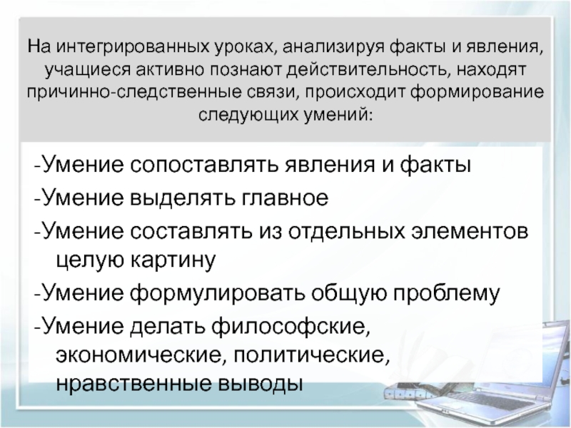 Слайд 12На интегрированных уроках, анализируя факты и явления, учащиеся активно познают действительность,