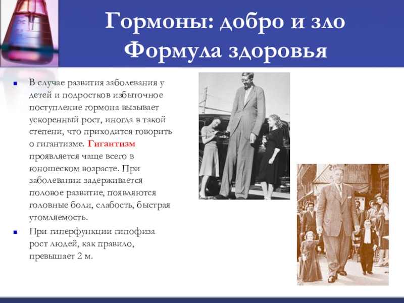 и подростков избыточное поступление гормона вызывает ускоренный рост, иногда в такой степени, что приходится говорить о гигантизме. Гигантизм проявляется чаще всего в юношеском возрасте. При заболевании задерживается половое развитие, появляются головные боли, слабость, быстрая утомляемость.