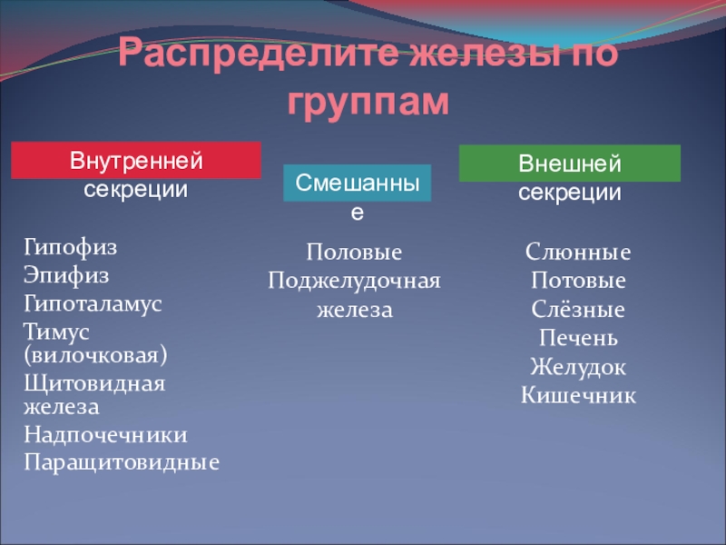 Слайд 20Распределите железы по группам