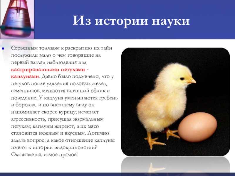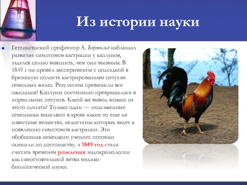 чем говорящие на первый взгляд наблюдения над кастрированными петухами - каплунами. Давно было подмечено, что у петухов после удаления половых желез, семенников, меняются внешний облик и поведение. У каплуна уменьшаются гребень и бородка, и по внешнему виду он напоминает скорее курицу; исчезает агрессивность, присущая нормальным петухам; каплуны жиреют, а их мясо становится нежным и вкусным. Логично задать вопрос: а какое отношение каплуны имеют к истории эндокринологии? Оказывается, самое прямое!