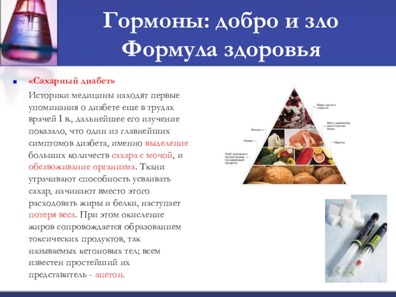 находят первые упоминания о диабете еще в трудах врачей I в., дальнейшее его изучение показало, что один из главнейших симптомов диабета, именно выделение больших количеств сахара с мочой, и обезвоживание организма. Ткани утрачивают способность усваивать сахар, начинают вместо этого расходовать жиры и белки, наступает потеря веса. При этом окисление жиров сопровождается образованием токсических продуктов, так называемых кетоновых тел; всем известен простейший их представитель - ацетон.