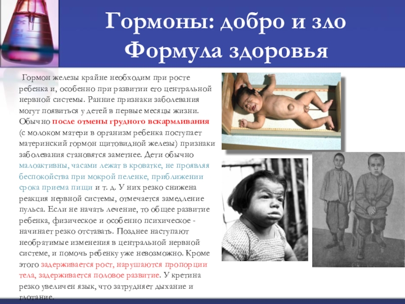 крайне необходим при росте ребенка и, особенно при развитии его центральной нервной системы. Ранние признаки заболевания могут появиться у детей в первые месяцы жизни. Обычно после отмены грудного вскармливания (с молоком матери в организм ребенка поступает материнский гормон щитовидной железы) признаки заболевания становятся заметнее. Дети обычно малоактивны, часами лежат в кроватке, не проявляя беспокойства при мокрой пеленке, приближении срока приема пищи и т. д. У них резко снижена реакция нервной системы, отмечается замедление пульса. Если не начать лечение, то общее развитие ребенка, физическое и особенно психическое - начинает резко отставать. Позднее наступают необратимые изменения в центральной нервной системе, и помочь ребенку уже невозможно. Кроме этого задерживается рост, нарушаются пропорции тела, задерживается половое развитие. У кретина резко увеличен язык, что затрудняет дыхание и глотание.