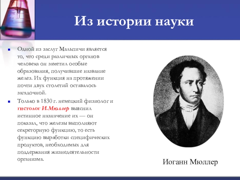 Только в 1830 г. немецкий физиолог и гистолог И.Мюллер выяснил истинное назначение их — он показал, что железы выполняют секреторную функцию, то есть функцию выработки специфических продуктов, необходимых для поддержания жизнедеятельности организма.