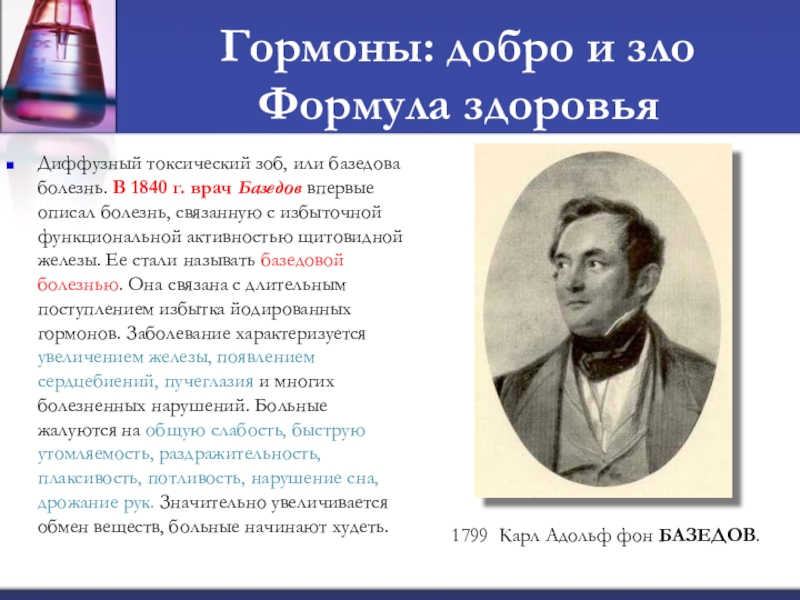 В 1840 г. врач Базедов впервые описал болезнь, связанную с избыточной функциональной активностью щитовидной железы. Ее стали называть базедовой болезнью. Она связана с длительным поступлением избытка йодированных гормонов. Заболевание характеризуется увеличением железы, появлением сердцебиений, пучеглазия и многих болезненных нарушений. Больные жалуются на общую слабость, быструю утомляемость, раздражительность, плаксивость, потливость, нарушение сна, дрожание рук. Значительно увеличивается обмен веществ, больные начинают худеть.