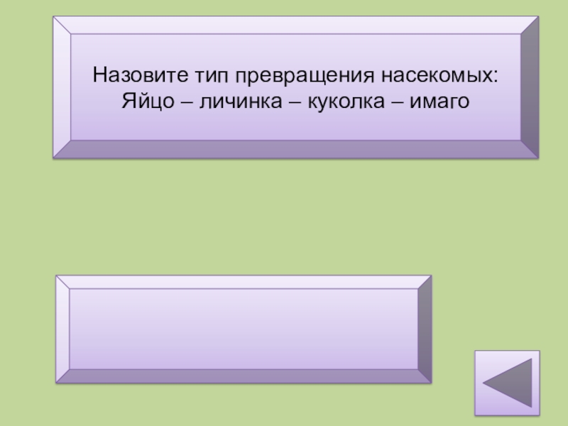 Назовите тип превращения насекомых:Яйцо – личинка – куколка – имагоПолный метаморфоз