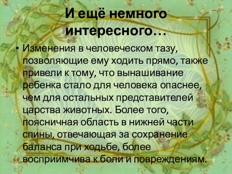 И ещё немного интересного…Изменения в человеческом тазу, позволяющие ему ходить прямо, также привели к тому, что вынашивание